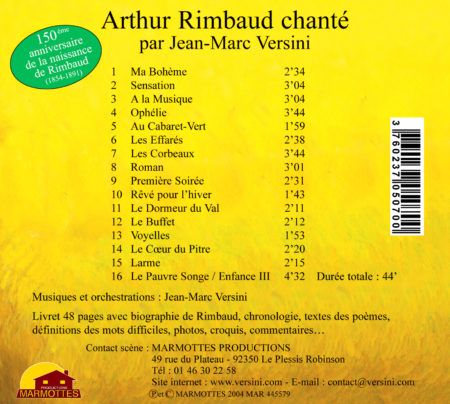 Cet album rassemble 17 des plus beaux poèmes d’Arthur Rimbaud (1854-1891) mis en musique : Ma Bohème, Le dormeur du val, Voyelles, Le Buffet, Sensation… Ces poèmes intemporels ont été composés alors que le poète avait entre 15 et 17 ans ! Les musiques et orchestrations, signées de Jean-Marc Versini, soulignent avec beaucoup de finesse et de sensibilité, l’émotion et les vagabondages de ce poète maudit du 19ème siècle.