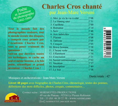 Livret 48 pages avec biographie de Charles Cros, chronologie, textes des poèmes, définitions des mots difficiles, photos, croquis, commentaires…