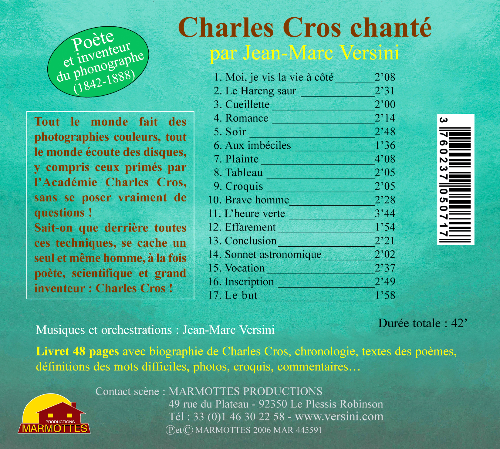 Si Charles Cros (1842-1888) était un poète génial, il était également scientifique et grand inventeur. Il inventa le phonographe et le principe de la photographie des couleurs. Il fut une célébrité du Paris littéraire de la 2ème partie du 19ème siècle, côtoyant Rimbaud, Verlaine, Mallarmé… Certains de ses poèmes, comme le Hareng Saur, furent d’ailleurs mis en musique et connurent un succès retentissant. Un CD magnifique où les textes sont portés par d’envoutantes musiques.