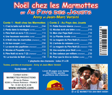 Conte 1 – Noël chez les Marmottes : 1. C’est la belle nuit de Noël (chanson) – 2. Perdu dans la montagne (conte) – 3. Père Noël où es-tu ? (1) (chanson couplet 1) – 4. Une heureuse rencontre (conte) – 5. A Noël chez les marmottes (chanson) – 6. Un bon souper (conte) – 7. Le secret des papillotes (chanson) – 8. Nicolas et Poupette (conte) – 9. Père Noël où es-tu ? (2) (chanson couplet 2) – 10. La tournée de Noël (conte)