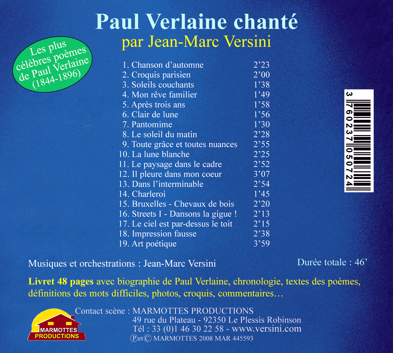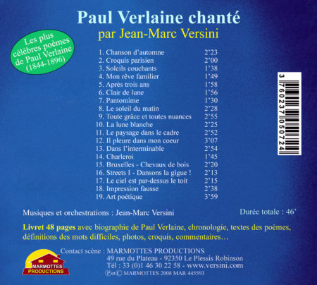 CD: Digipack – Livret 48 pages avec biographie de Verlaine, chronologie, textes des poèmes, définition des mots difficiles, photos, croquis, commentaires…