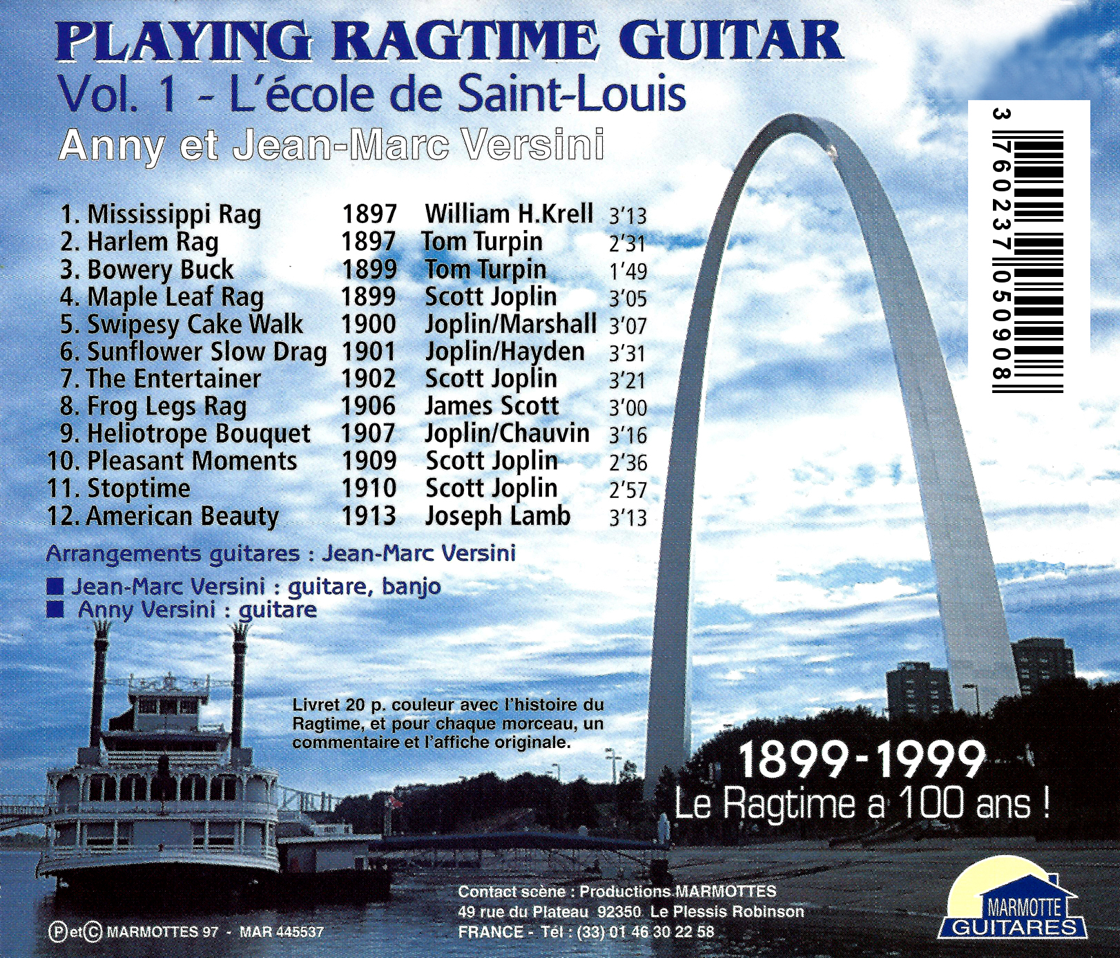 Anny et Jean-Marc Versini, « n°1 du Ragtime Guitar en France », proposent ici 12 « Classic Ragtimes » adaptés pour 2 guitares. De Mississippi Rag (1897) à American Beauty (1913) en passant par les incontournables Maple Leaf Rag et The Entertainer de Scott Joplin, ce disque nous transporte dans la « Belle Epoque » du Ragtime.