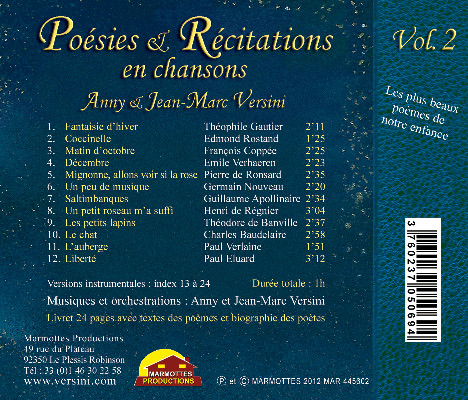 Anny et Jean-Marc Versini revisitent dans ce deuxième opus les poèmes qui ont bercé notre enfance, en y apportant leur musicalité, leurs voix et une émotion certaine qui en font un ravissement pour les oreilles. Pierre de Ronsard, Charles Baudelaire, Théophile Gautier, Paul Eluard, Guillaume Apollinaire, Paul Verlaine et bien d’autres… sont au programme de ce deuxième opus. Plus besoin de passer des heures à apprendre ces vers intemporels. Grâce à la mise en musique, on apprend sans même s’en rendre compte ! De plus la version instrumentale permet de chanter soi-même ces poésies.